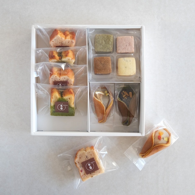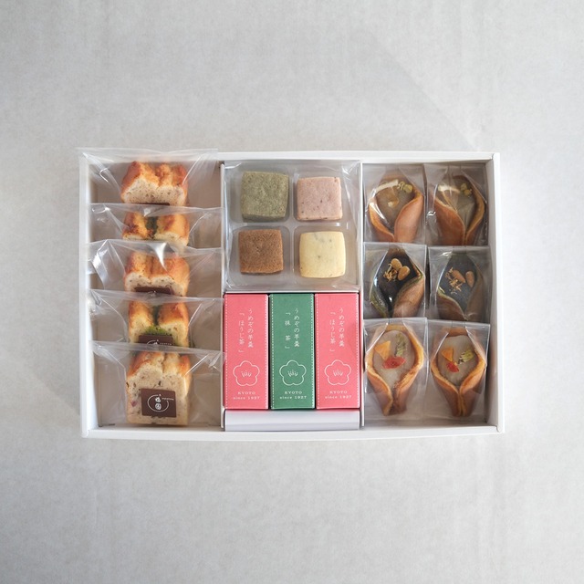 ★大切なお願い★ 商品が到着しましたら、直射日光を避け、25度以下の常温で保存して下さい。 ※この商品は冷凍商品「みたらしバターサンド」とは同梱できません。 お手数おかけしますが別々にご注文頂きますよう、お願いいたします。 ◯納品書、領収書をご要望の方は、備考欄にお願いいたします。 ◯熨斗は「無地のし」のみ対応しております。 選択ボタンより選択いただき名入れ希望の方は必ず備考欄にお名前をご記入ください。 ◯包装をご希望の方は、備考欄にてお申し付けください。 ※希望日のご指定がない場合は1番早い発送日でお送りさせて頂きます。 京都『梅園 oyatsu』の人気のおやつを春のお味でたっぷり詰め合わせました。 ご自宅でのコーヒータイムやおやつ時間のお供に。また、大切な方への贈りものにもおすすめです。 [セット内容] 蒸し焼きあんケーキ5個(さくら×3個、抹茶レモン×2個)、羊羹ほうじ茶×2本、抹茶×1本、あんがさね(はる4種)×1セット、あんの花束(はる3種)×2セット ●蒸し焼きあんケーキ 2種 たっぷりの餡と、ふんわり泡立てた卵を合わせて蒸し焼きにした、しっとりと軽い食感のあんケーキです。 桜花と葉の塩漬けを使用し桜の香りと春を感じる味わい「さくら」と、抹茶の香りと爽やかなレモンがマッチした「抹茶レモン」。 [賞味期限]いずれも製造日より14日 [特定原材料等28品目]小麦・乳成分・卵 ●うめぞの羊羹 まるで生チョコレートのような、なめらかな口溶け・・・ お茶はもちろん、コーヒーや紅茶とも相性の良い一口サイズの羊羹です。 〇抹茶:上品な甘みの白あんに、抹茶をたっぷり練り込んだ濃厚な味わい 〇ほうじ茶:上品な白あんの甘みと、香ばしい焙じ茶の香りを楽しめるお味 [賞味期限]12ヶ月 [特定原材料等28品目]なし ●あんがさね【はる】 4種1セット 口溶け柔らかな焼き菓子に餡をはさみ、しっとりと仕上げたお菓子です。 それぞれ異なった風味のクッキーと餡の組み合わせで、繊細なお味の重なりをお楽しみください。 フランボワーズチェリー/煎茶オレンジ/コーヒーシナモン/さくら [賞味期限]製造日より30日 [特定原材料等28品目]小麦・乳成分・卵・オレンジ・カシューナッツ ●あんの花束【はる】 3種2セット もっちりとした生地でさまざまな餡を包んだ、見た目にも愛らしい“和菓子の花束”です。 ※蜂蜜を使用しておりますので、1歳未満の乳児には与えないで下さい。 はちみつカモミール/よもぎ黒糖/杏仁 [賞味期限]製造日より14日 [特定原材料等28品目]卵・小麦・乳成分・キウイ
