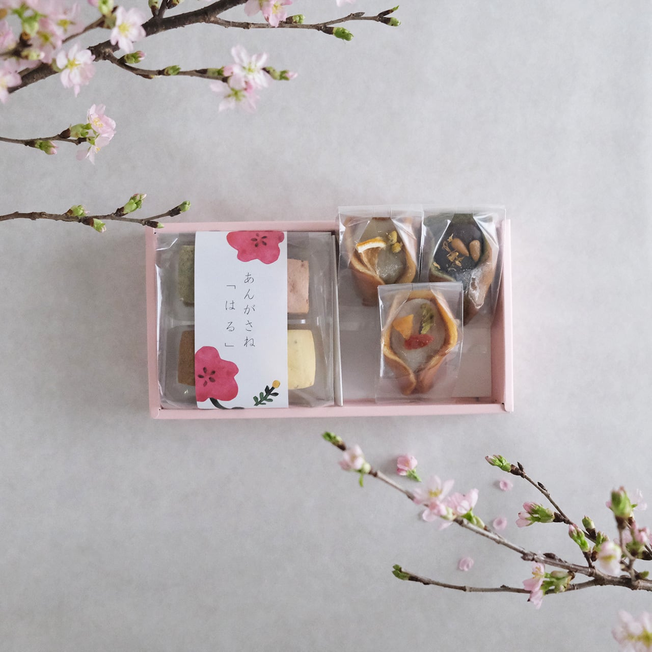 こころ弾む季節のお味、あんの花束・あんがさねの「はる」を詰め合わせました。どちらも梅園の人気のおやつです。是非ご賞味くださいませ。